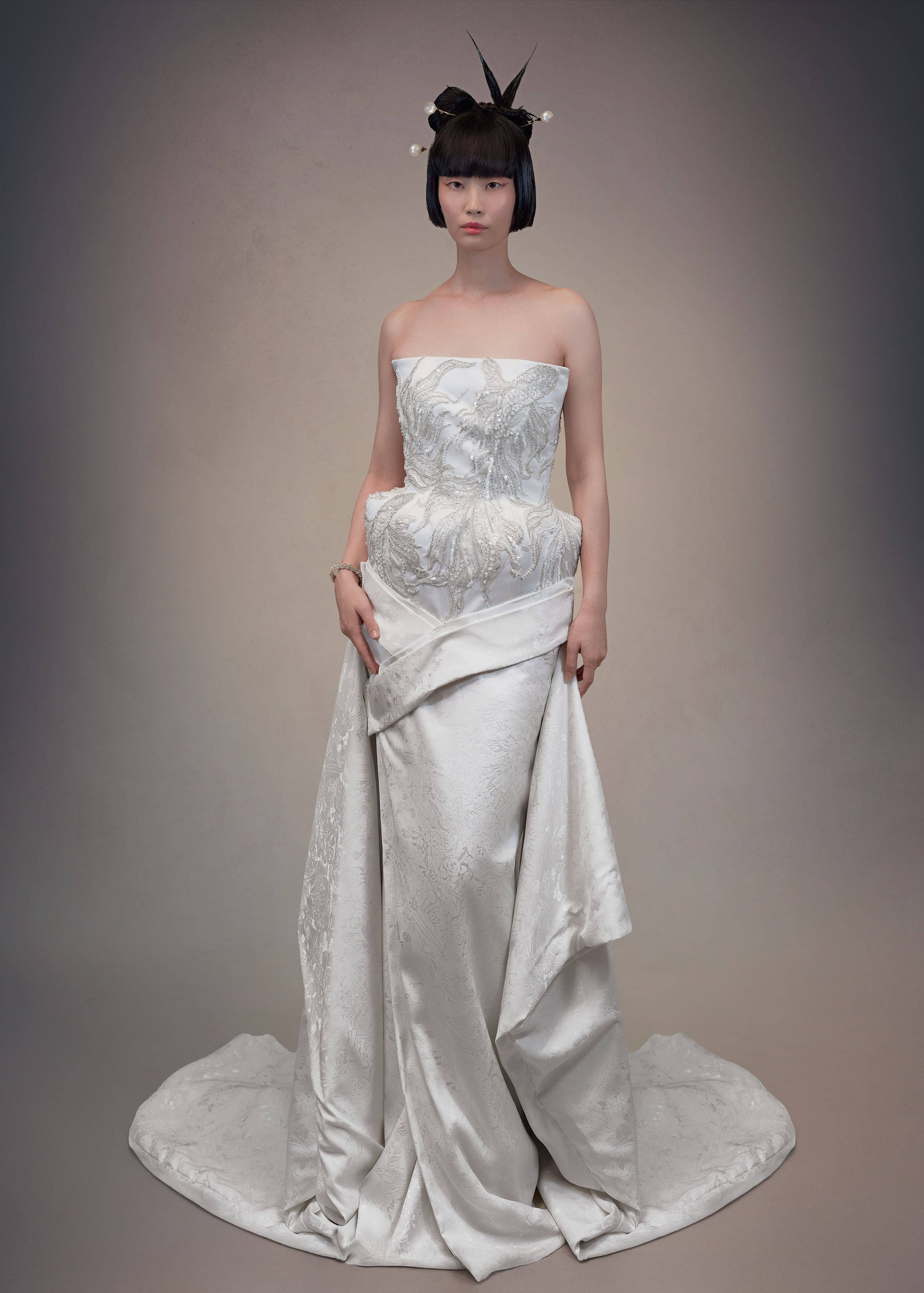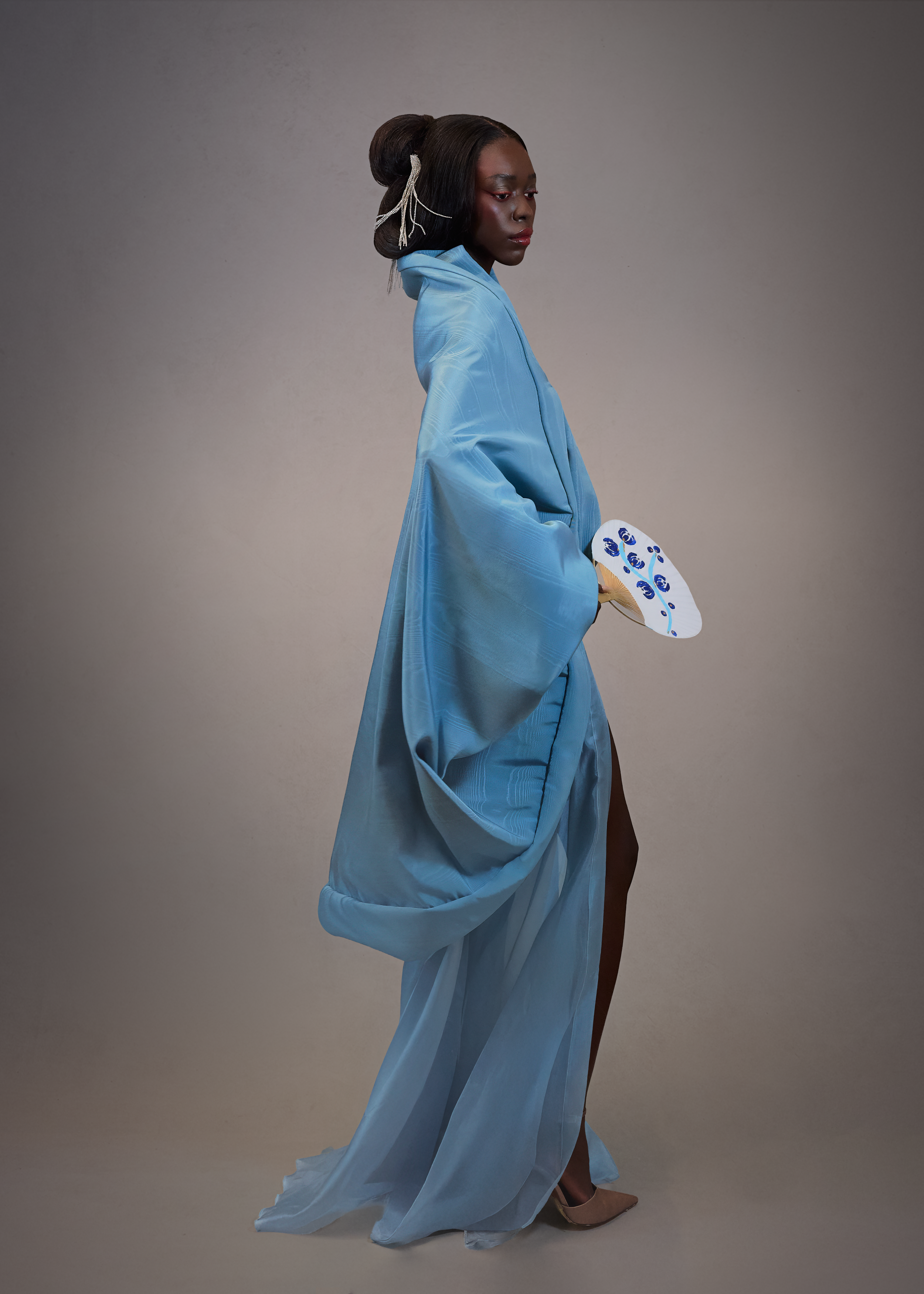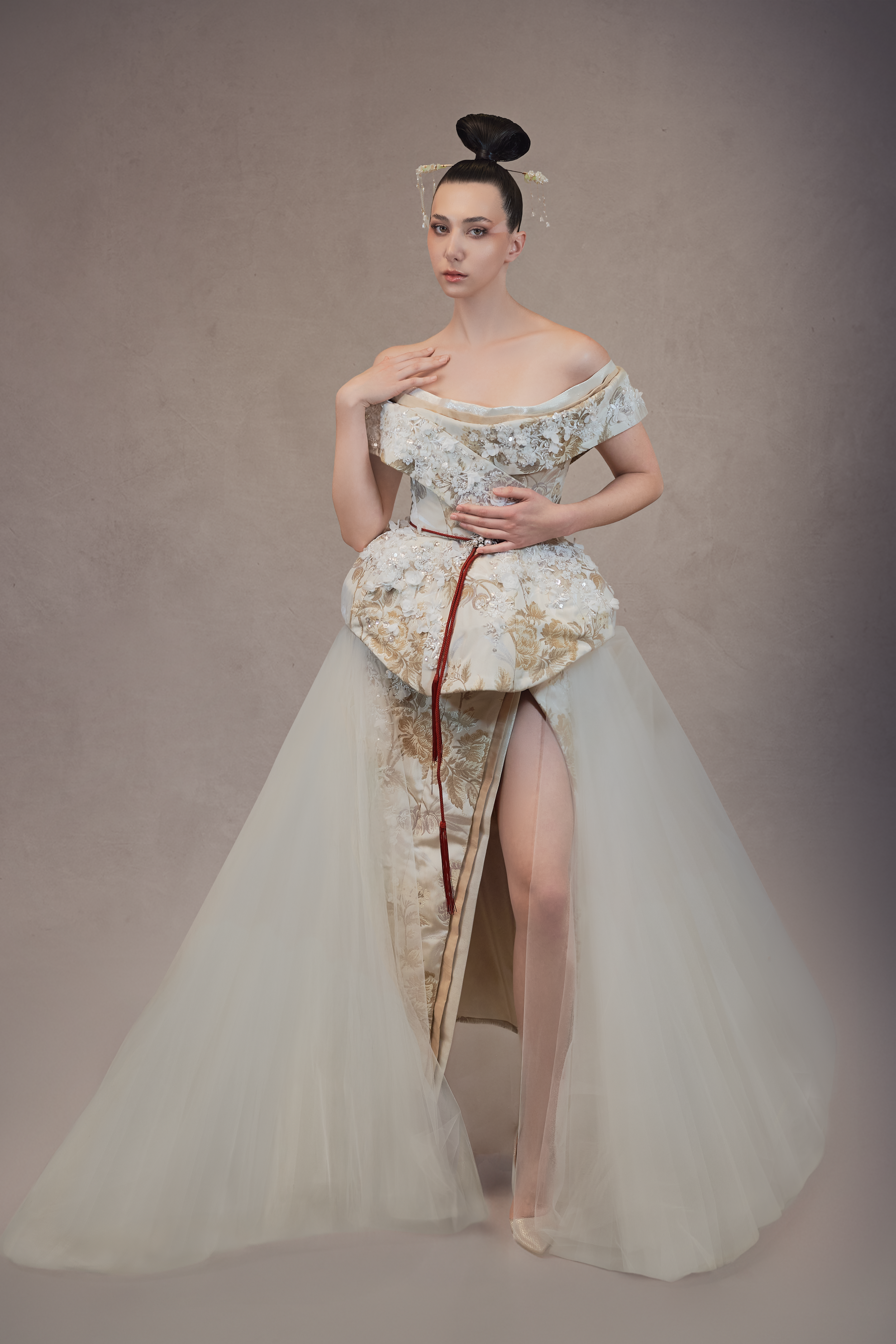 Au cœur de cette collection réside également Murasaki Shikibu, une pièce écrite par mon maître de danse et de théâtre, qui a éveillé en moi une fascination profonde pour ce pays. Entre la Haute Couture, Madama Butterfly de Puccini et la musique du shamisen, je puisais mon inspiration dans ses structures et ses silhouettes-une influence qui a marqué ma manière de créer depuis des années.